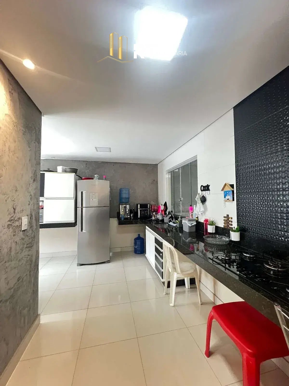 Área gourmet com 1 banheiro, 1 escritório, varanda colonial para 4 vagas de garagem, portão eletrônico, ar condicionado, bancada granito
